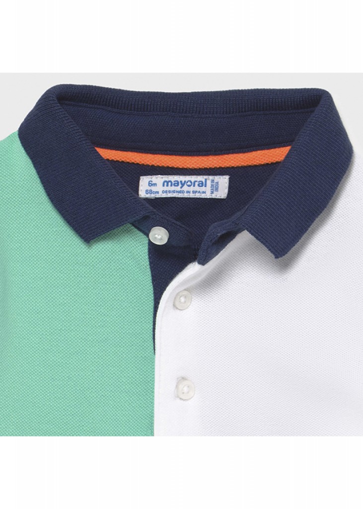 Polokošeľa s krátkym rukávom s kontrastnými detailmi pre chlapčeka. Golier s výstrihom do pólu s kontrastnými farebnými detailmi. Zapínanie na golier na gombíky pre ľahké nasadenie. Vyrobené z mäkkej elastickej bavlnenej tkaniny.