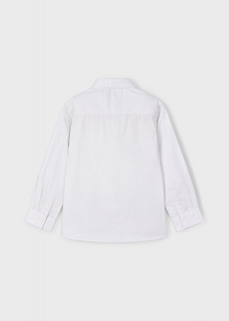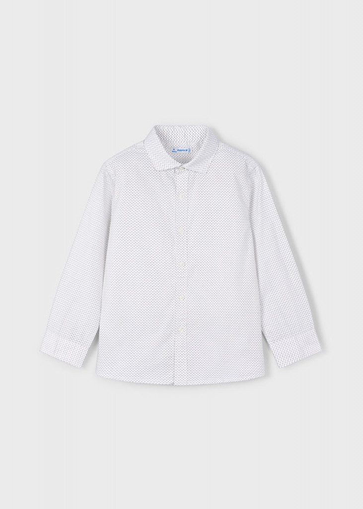 Chlapčenská košeľa s dlhými rukávmi. Golier. Zapínanie na gombíky vpredu. Vyrobená z pohodlnej popelínovej tkaniny, ktorá je ľahko udržiavateľná a odolná. Vzorovaný dizajn.