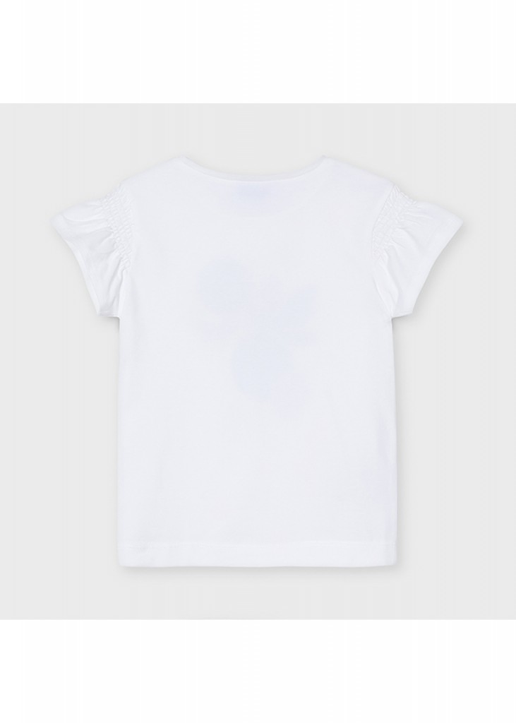 Tričko s krátkym rukávom a volánovými detailmi pre dievča. Okrúhly výstrih. Položka z našej základnej kolekcie s klasickým dizajnom, ideálna na doplnenie ľubovoľnej súpravy alebo vzhľadu. Vyrobené z mäkkej elastickej bavlnenej tkaniny. Dekoratívne prvky: dizajn na prednej strane.