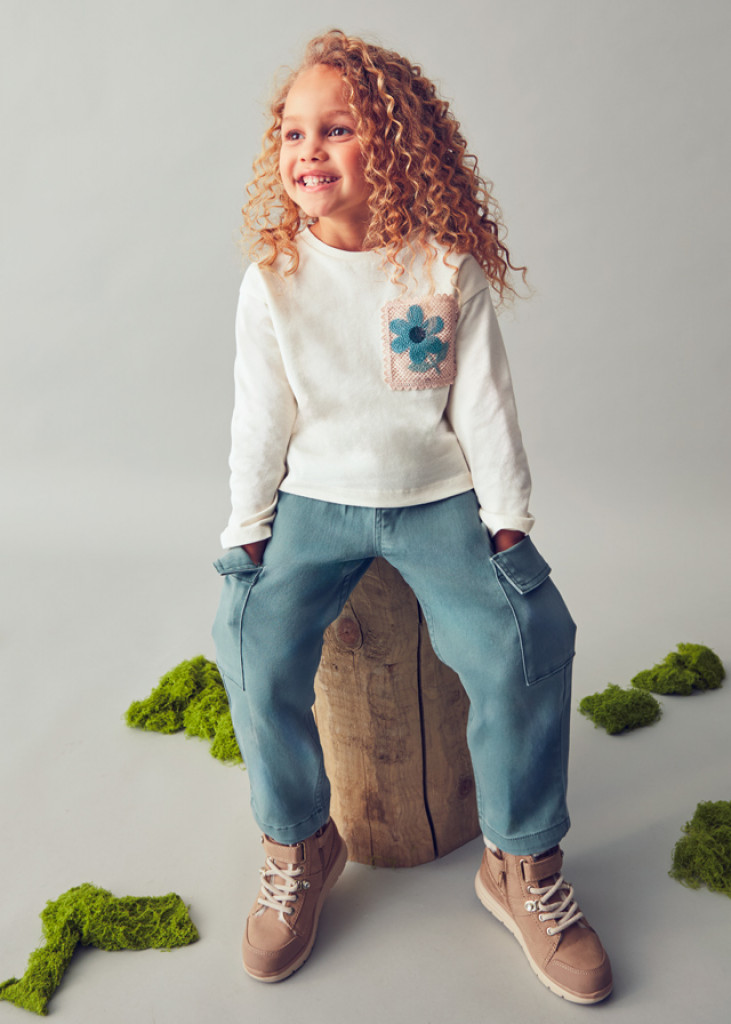 Dlhorukávové tričko pre dievčatá. Elastická, splývavá tkanina pre maximálny komfort na každodenné nosenie. Dekoratívne prvky: kvetinová nášivka, háčkované detaily.