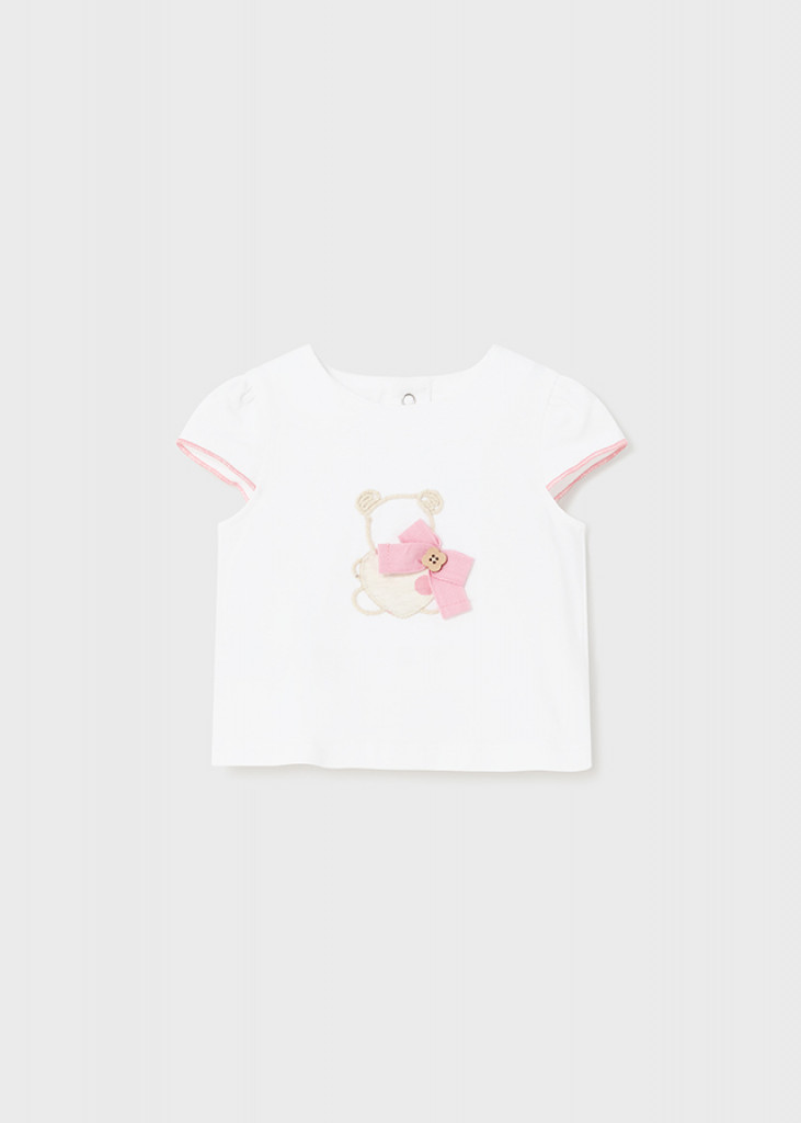 Tričko s krátkym rukávom pre dievčatá. Okrúhly výstrih. Zapínanie vzadu na patentky. Ozdobné prvky: výšivka.