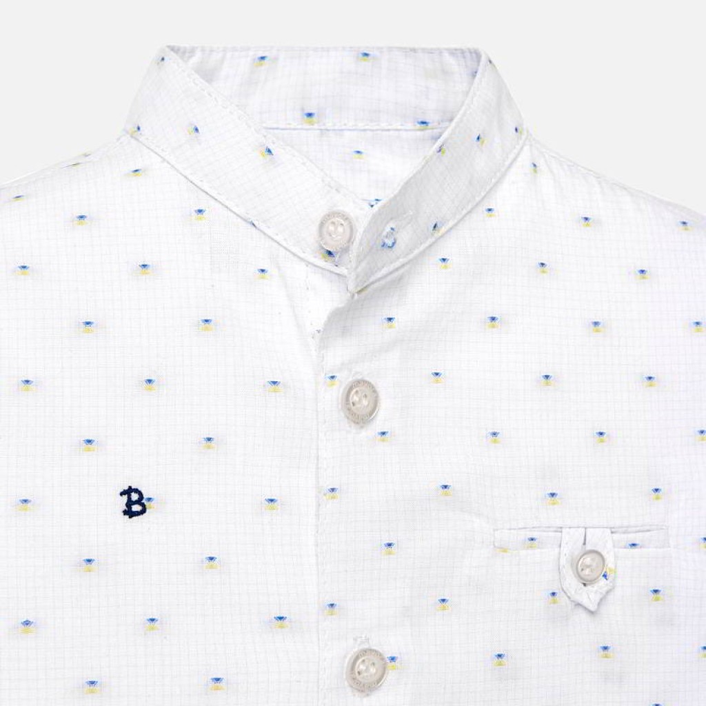 Košeľa s dlhým rukávom pre chlapcov. S gombíkom na boku na úpravu dlžky rukávov. Mao golier v rovnakej farbe. Zapínanie gombíkmi na prednej strane. Vyrobené z elegantného a sofistikovaného materiálu, ktorý sa môže nosiť pri najrôznejších príležitostiach. Funkčné predné vrecko. Dekoratívne prvky: výšivka.