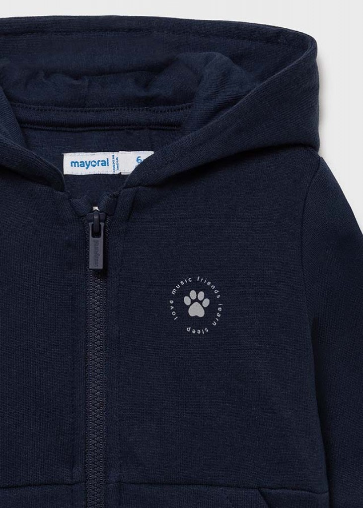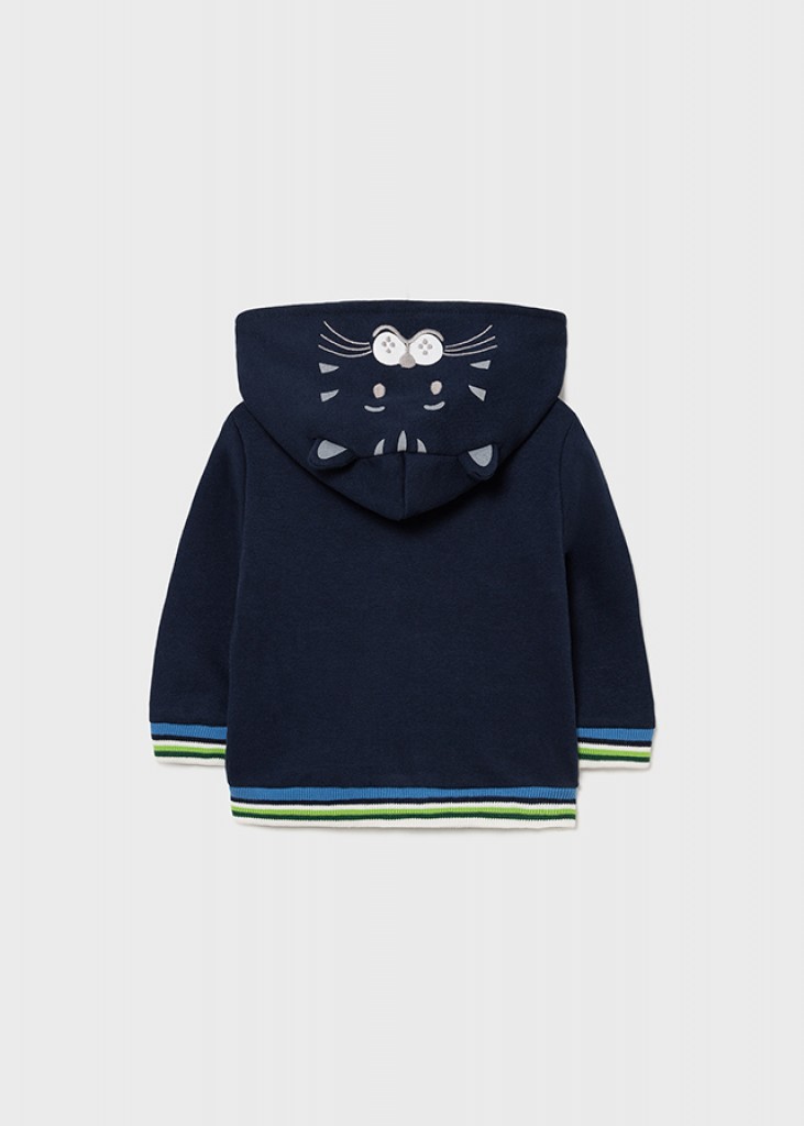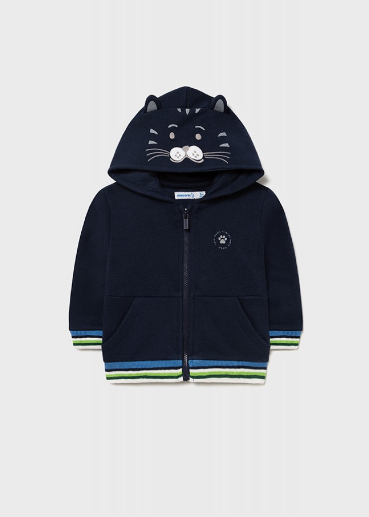 Mikina s dlhým rukávom pre chlapčeka od 6 do 36 mesiacov. Golier s kapucňou. Predné, centrálne zapínanie na zips. Teplá, hrubá fleecová tkanina, špeciálne navrhnutá na ochranu pred chladom. Funkčné predné vrecká. Dekoratívne prvky: aplikované motívy uší, výšivky, ozdobné vzory.