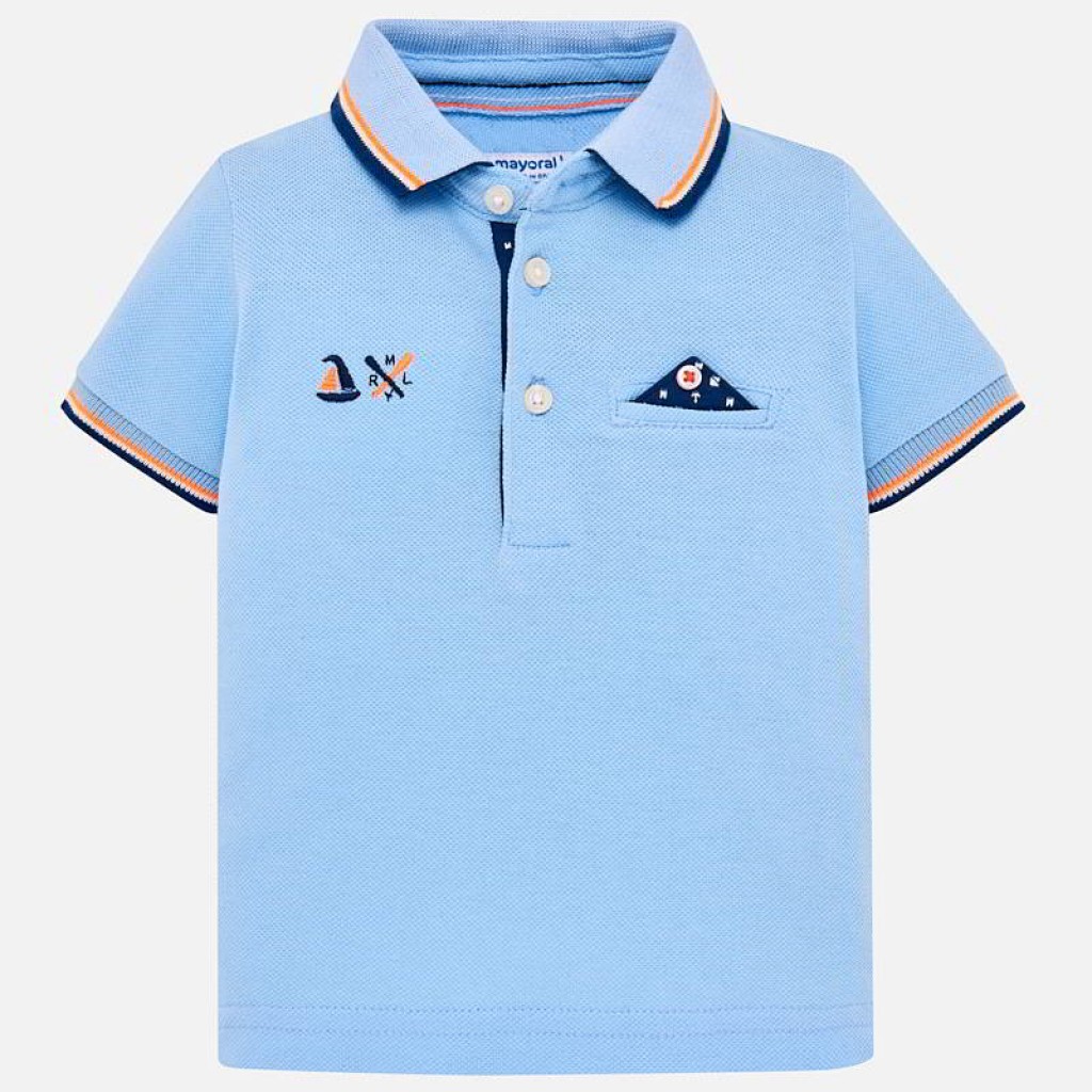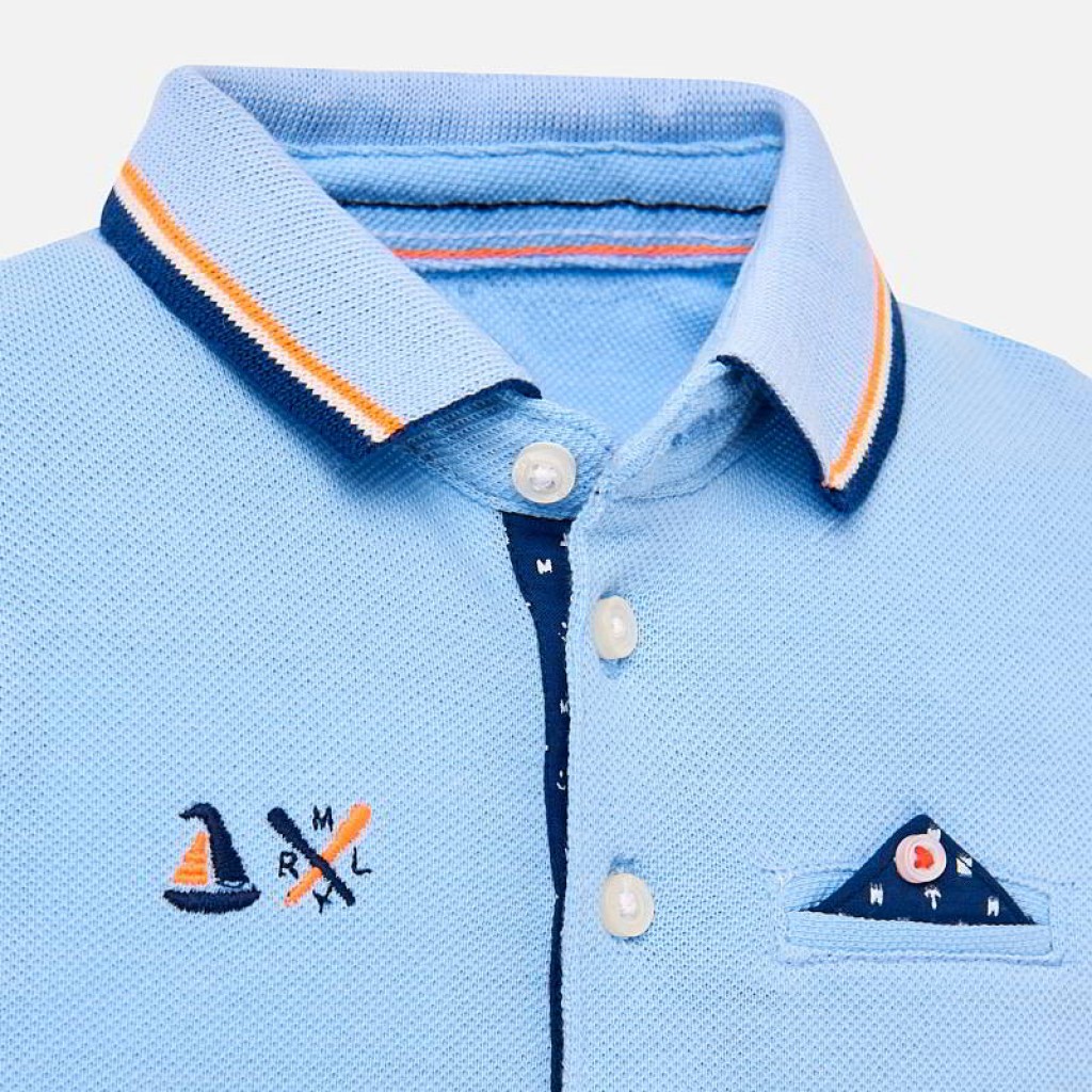 Polokošeľa s krátkym rukávom s kontrastnými detailami pre chlapcov. Polokošelový golier s kontrastným farebným detailom. Gombík je pripevnený pod golierom pre jednoduché oblečenie. Vyrobené zo 100% bavlnenej tkaniny. Bočné otvory na spodnej časti trička, ktoré umožňujú pohodlnejšie nosenie tovaru. Funkčné predné vrecko. Dekoratívne prvky: ozdobné aplikácie, vyšívanie.