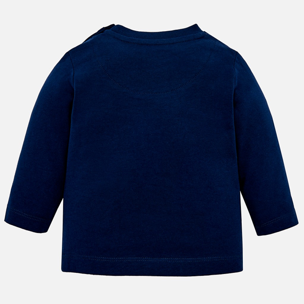 Long sleeved t-shirt for baby boy with a round neck collar in the same colour. There are snap-button fastenings on the shoulder, making it easy to dress your child. The t-shirt is made from soft, elasticated cotton fabric and has winter-themed printing on the front of the item.2D193