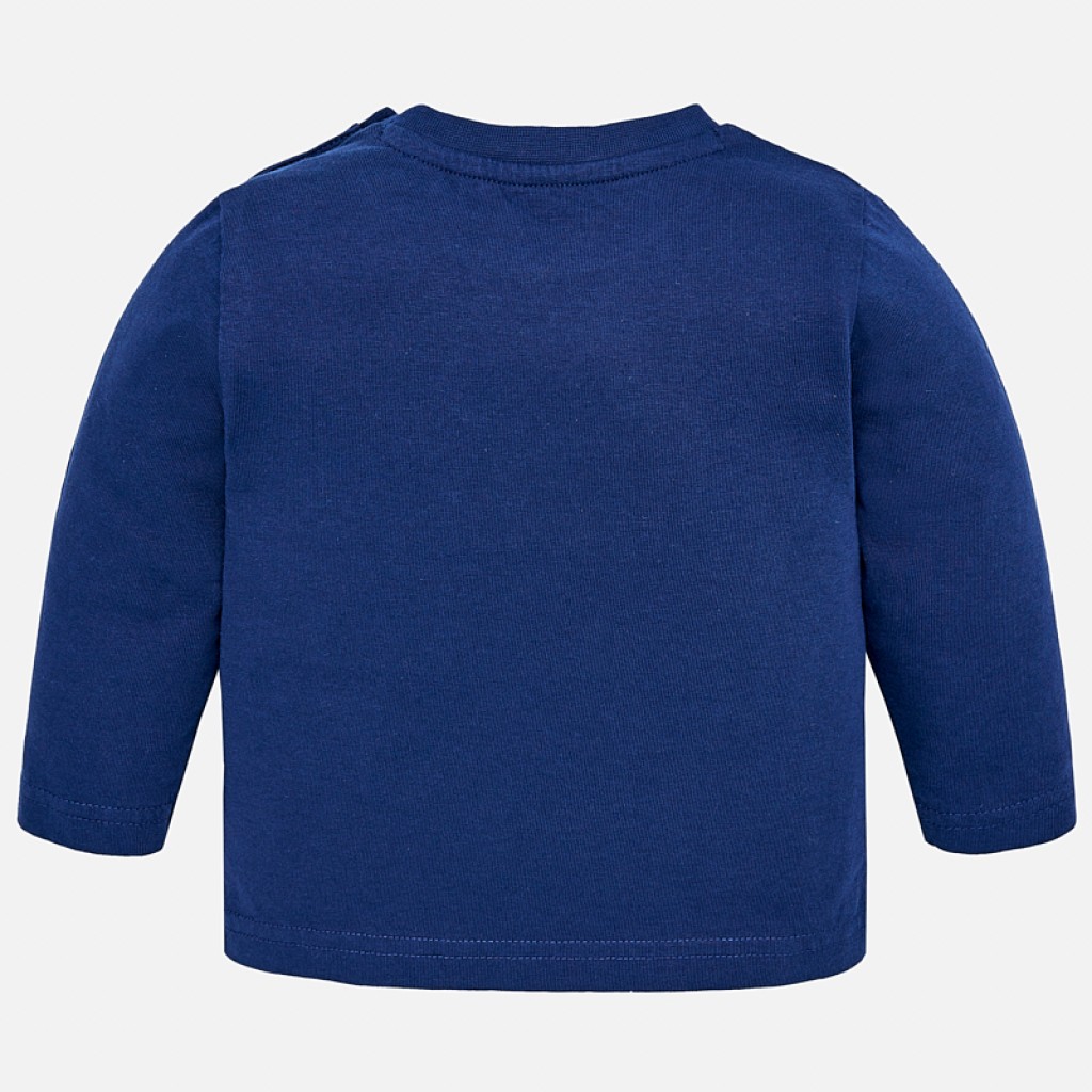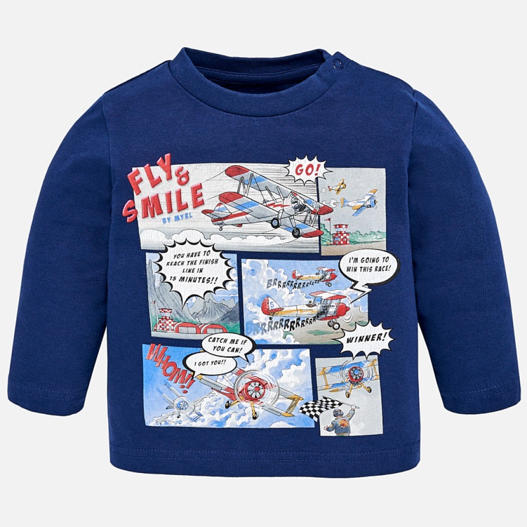 Long sleeved t-shirt for baby boy with a round neck collar in the same colour. There are snap-button fastenings on the shoulder, making it easy to dress your child. The t-shirt is made from soft, elasticated cotton fabric and has aviation-themed comic style motif printing on the front of the item.1D194-3