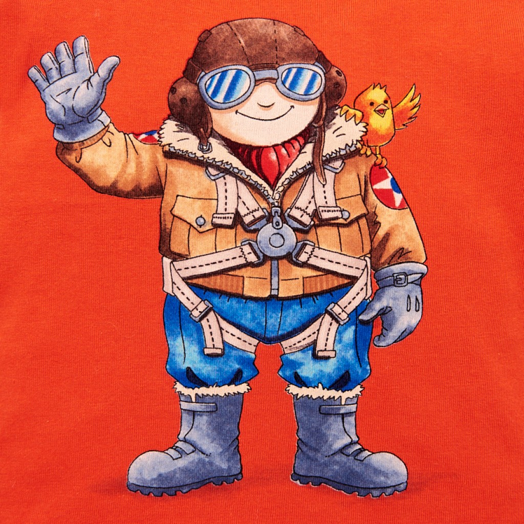 Long sleeved t-shirt for baby boy with a round neck collar in the same colour. There are snap-button fastenings on the shoulder, making it easy to dress your child. The t-shirt is made from soft, elasticated cotton fabric and has aviation-themed printing on the front and back of the item.2D193