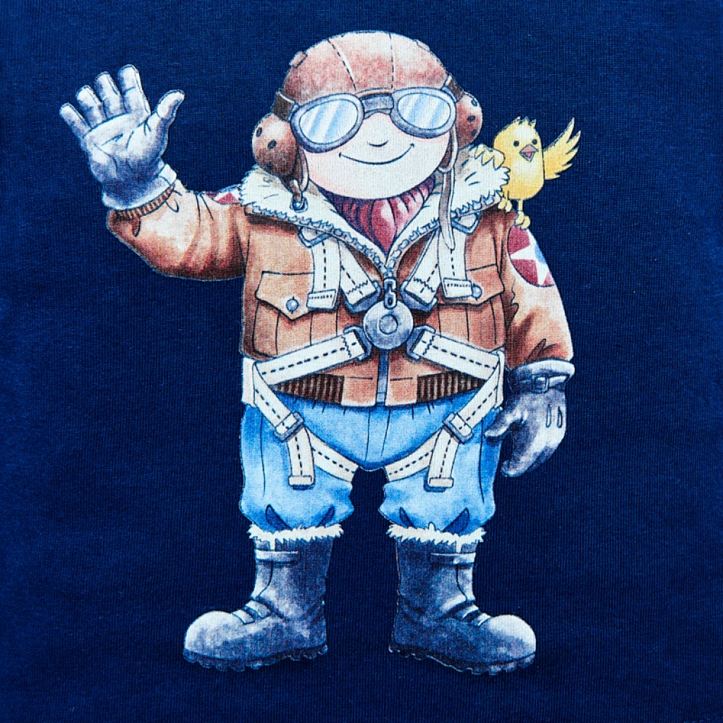 Long sleeved t-shirt for baby boy with a round neck collar in the same colour. There are snap-button fastenings on the shoulder, making it easy to dress your child. The t-shirt is made from soft, elasticated cotton fabric and has aviation-themed printing on the front and back of the item.