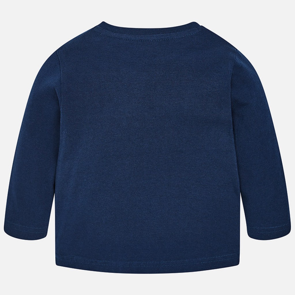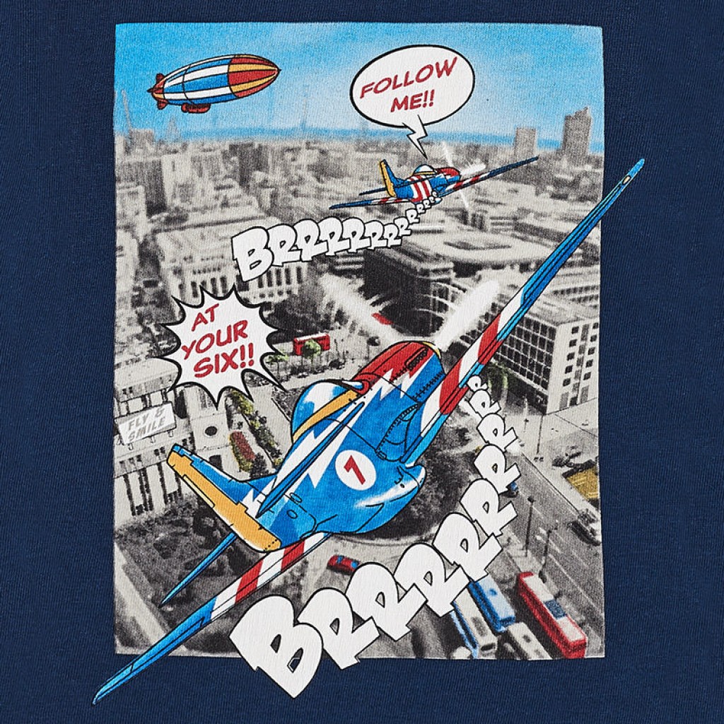 Long sleeved t-shirt for baby boy with a round neck collar in the same colour. There are snap-button fastenings on the shoulder, making it easy to dress your child. The t-shirt is made from soft, elasticated cotton fabric and has aviation-themed motif printing on the front of the item.2D191