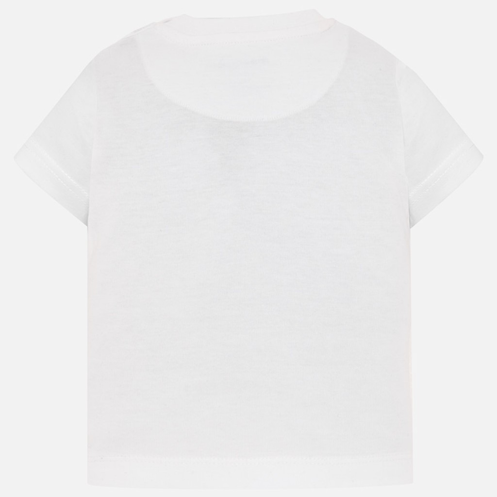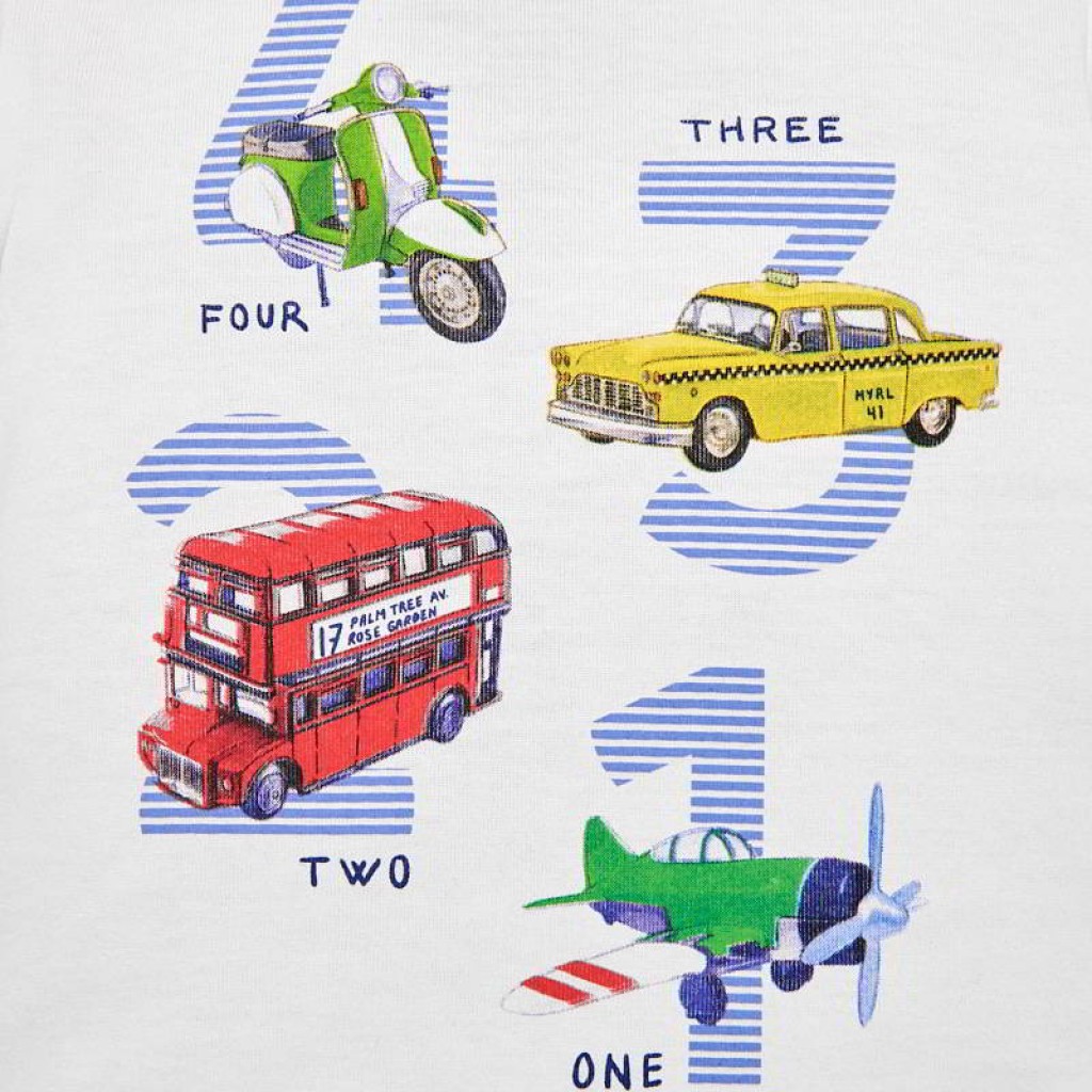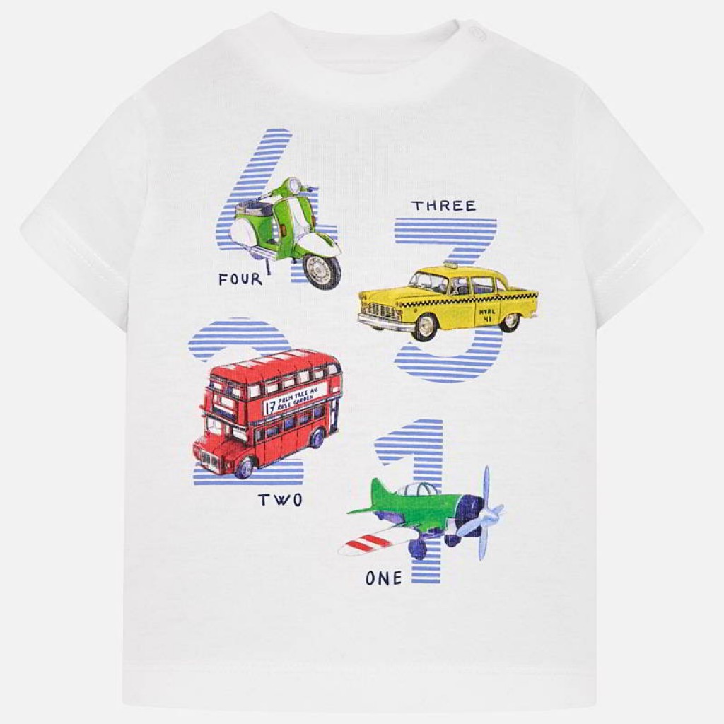 Tričko s krátkym rukávom pre chlapcov. Okrúhly výstrih. Uzatváracími patentmi na ramenách, ktoré umožňujú ľahké oblečenie odevu. Vyrobené zo 100% bavlnenej tkaniny. Dekoratívne prvky: potlač vpredu.