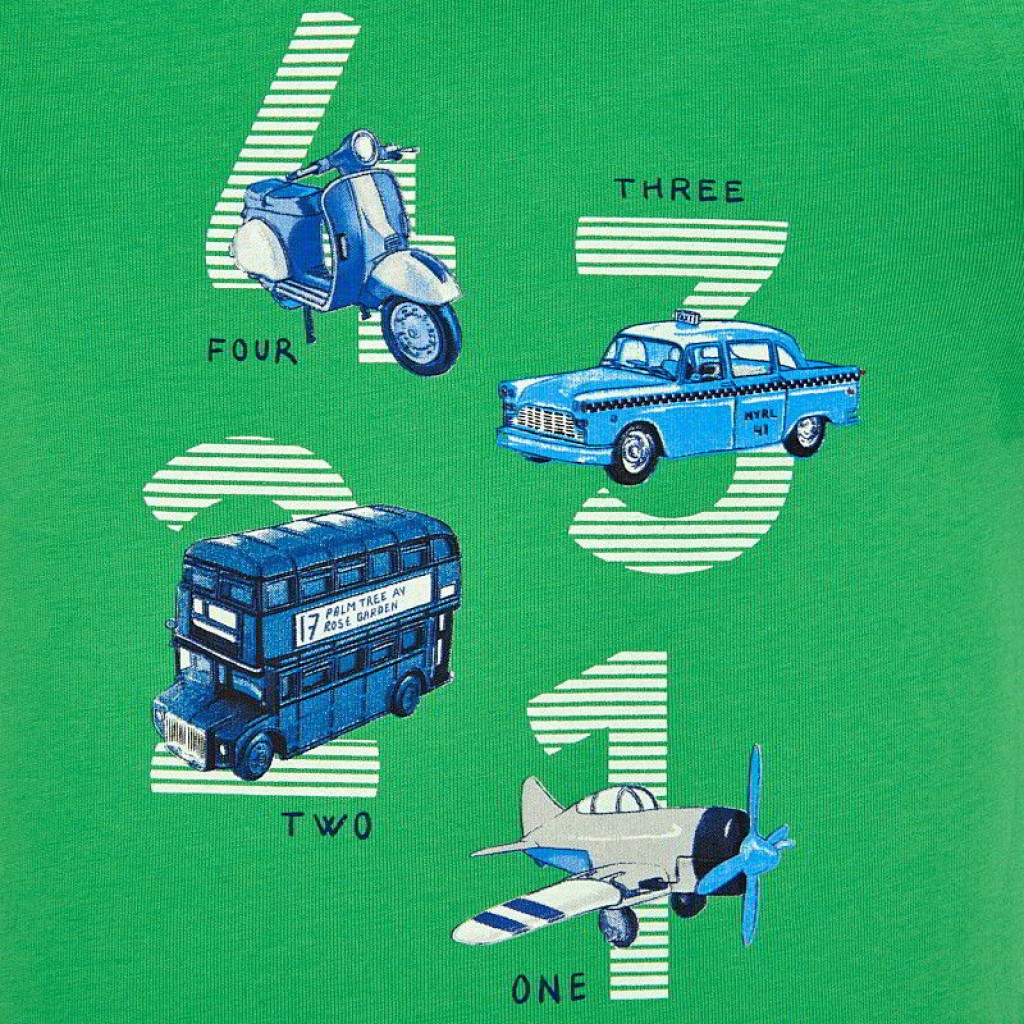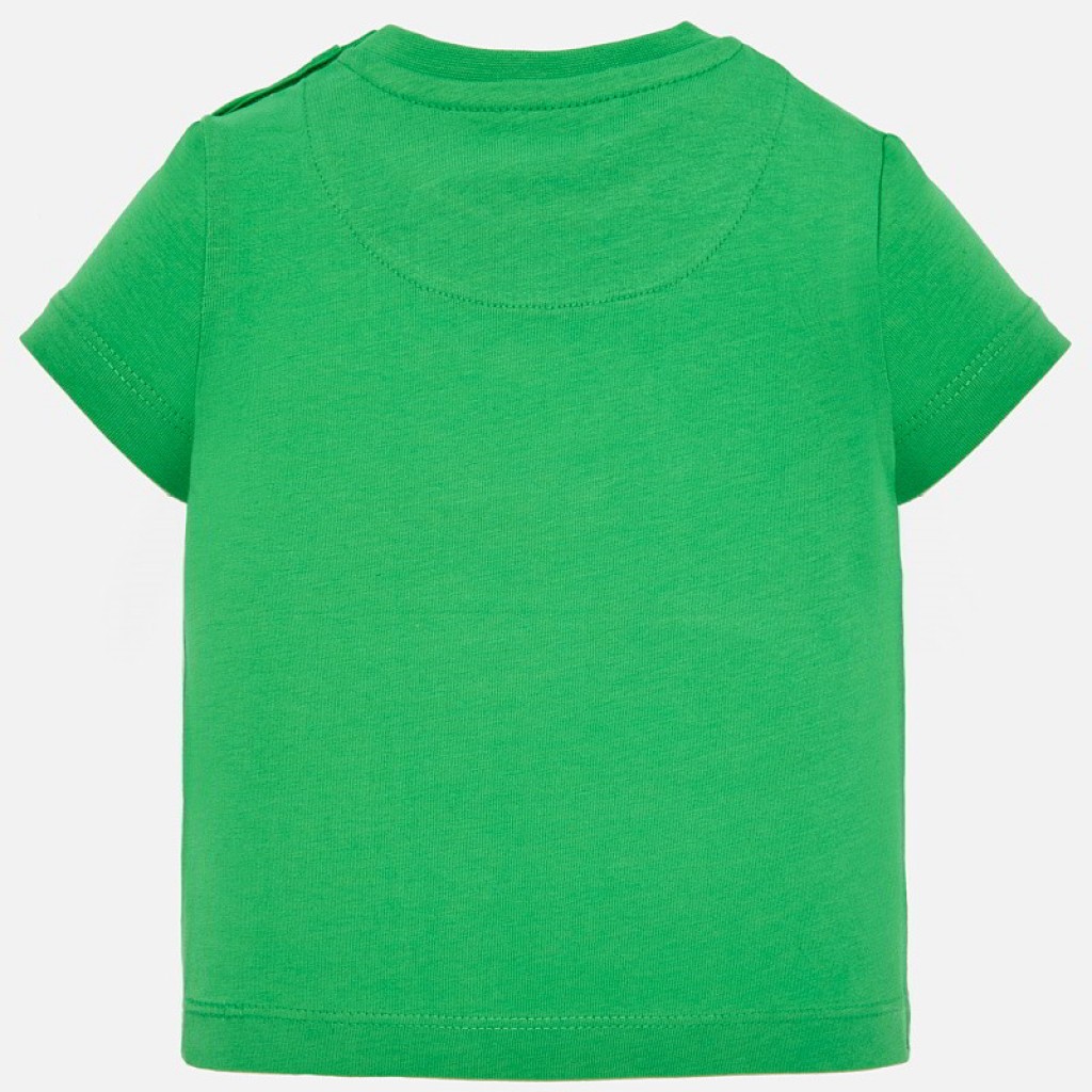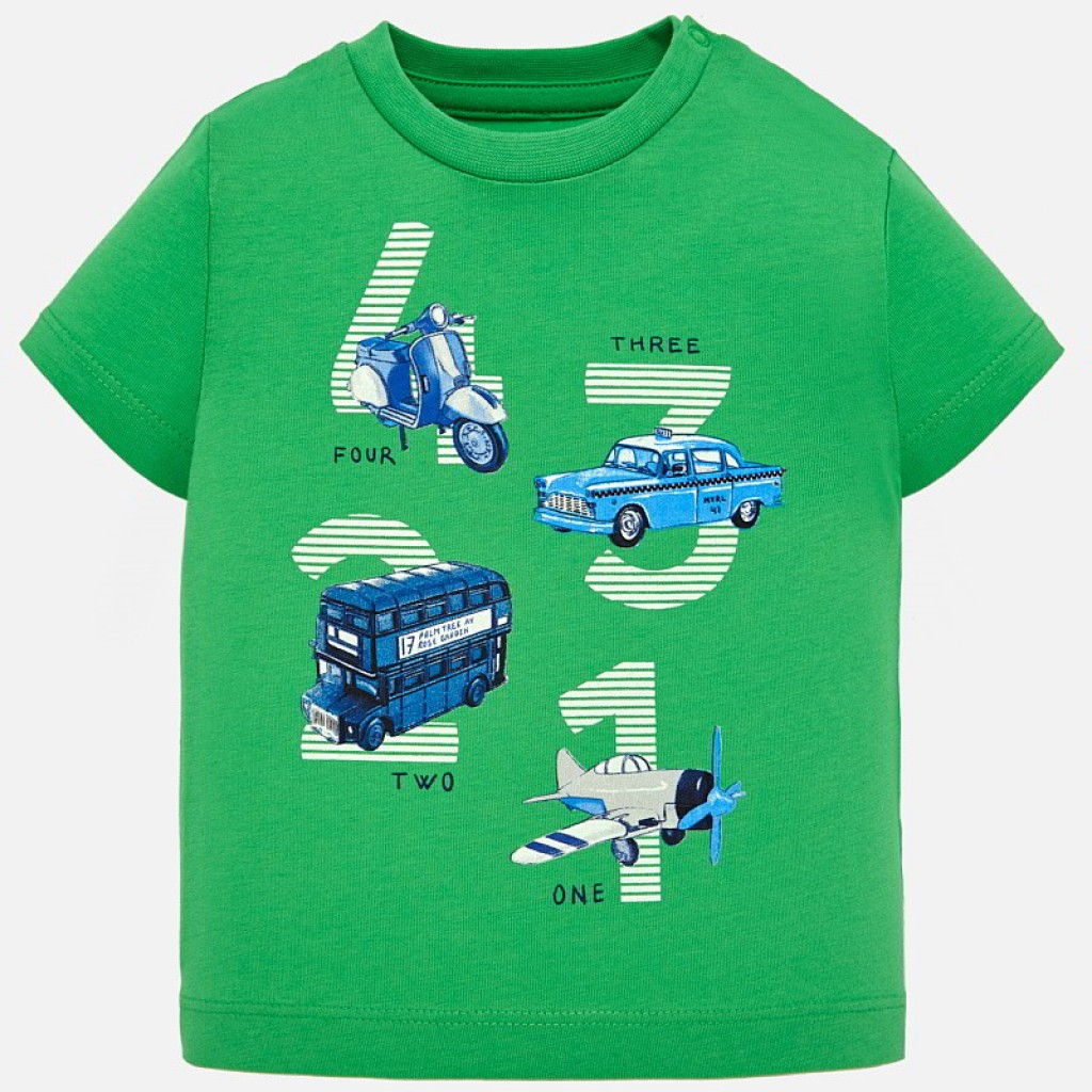 Tričko s krátkym rukávom pre chlapcov. Okrúhly výstrih. Uzatváracími patentmi na ramenách, ktoré umožňujú ľahké oblečenie odevu. Vyrobené zo 100% bavlnenej tkaniny. Dekoratívne prvky: potlač vpredu.