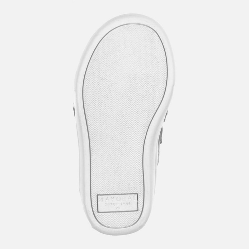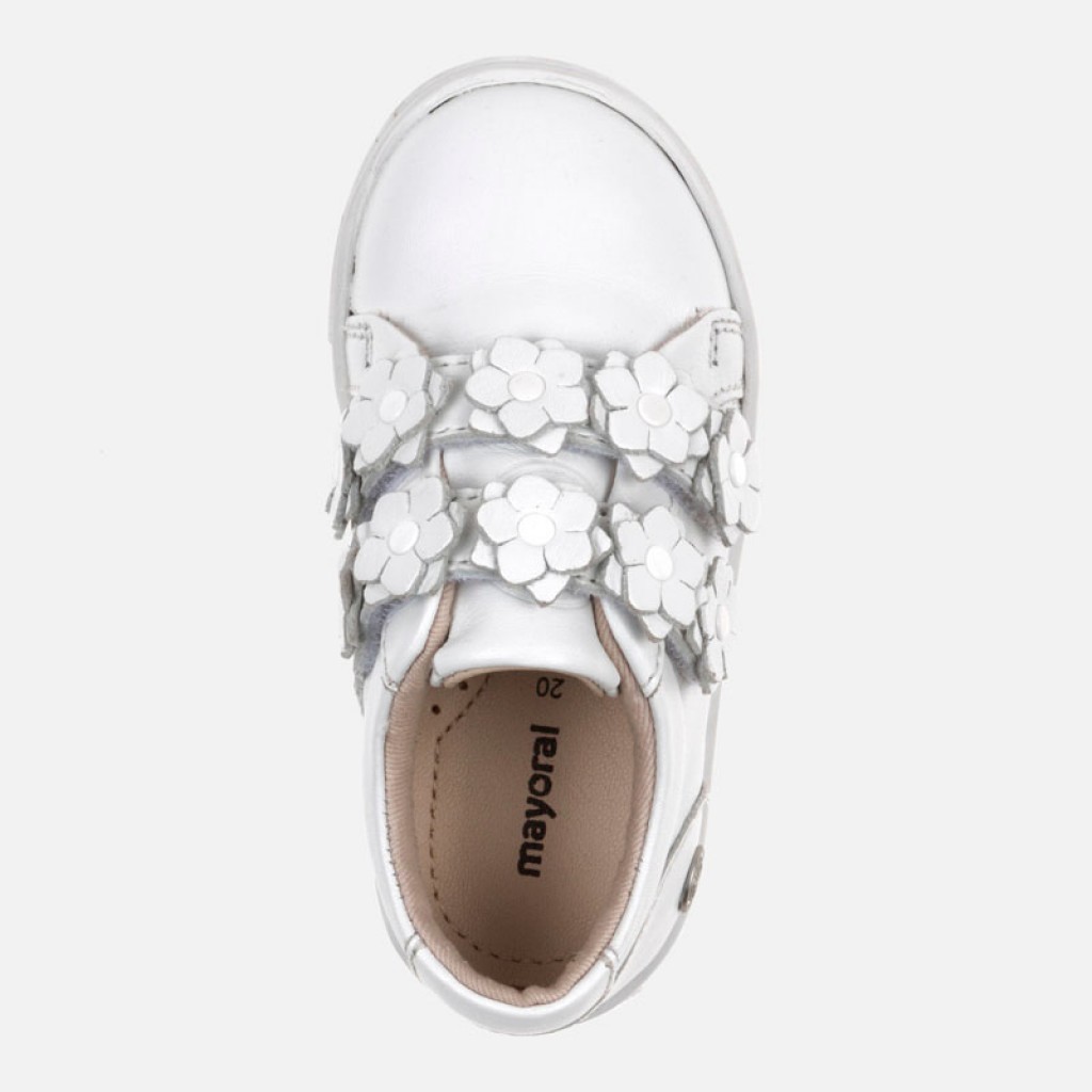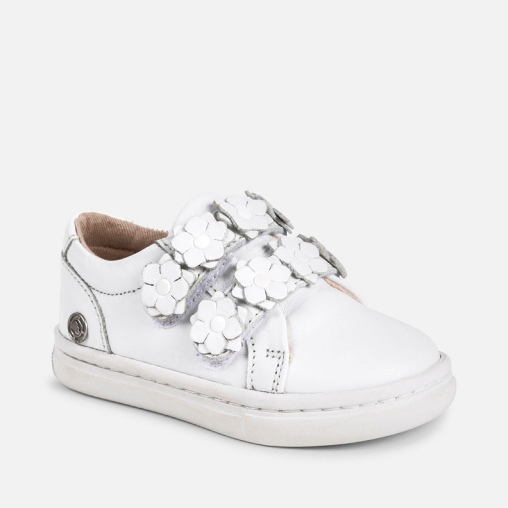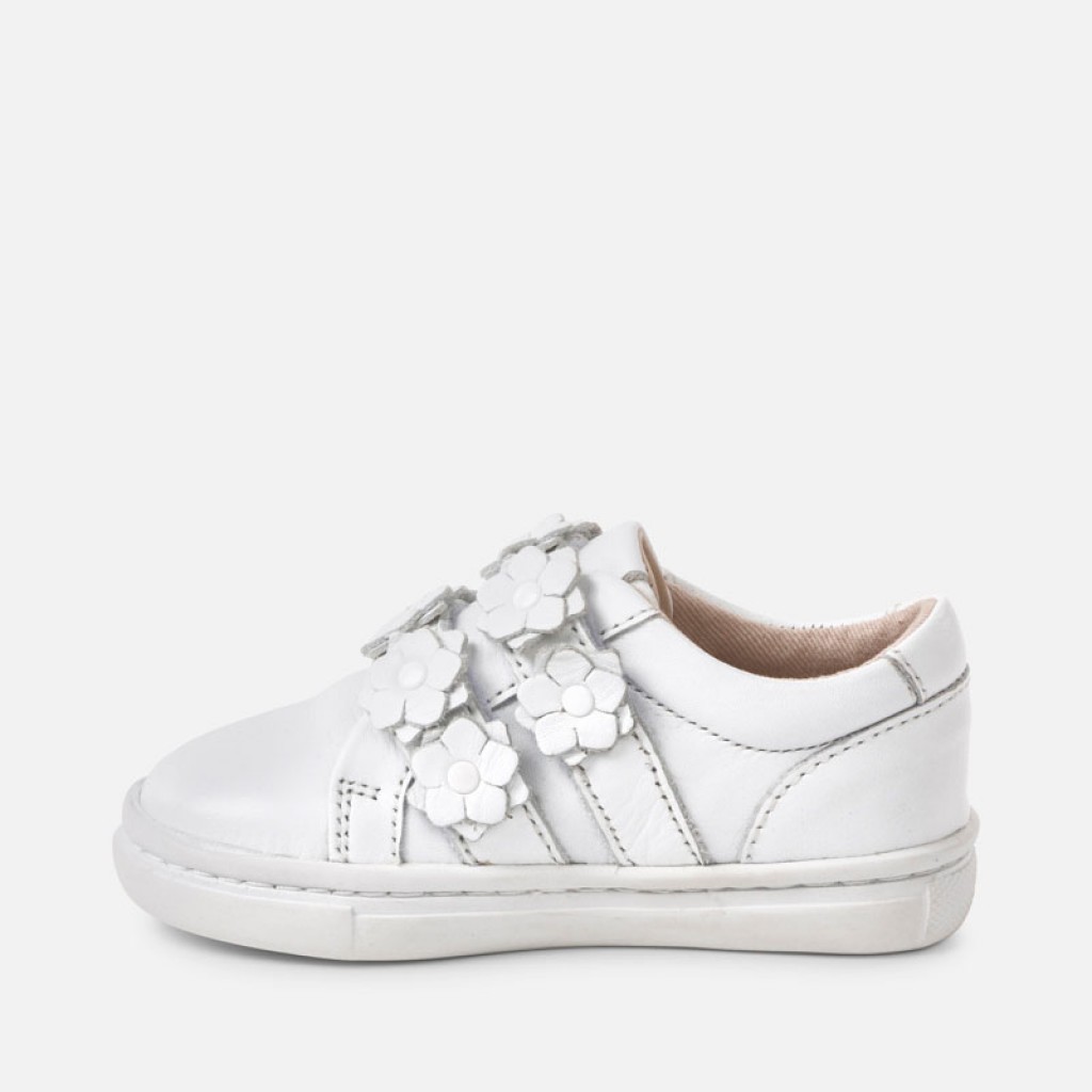 Topánky s bavlnenou vnútornou podšívkou a koženou stielkou. Vonkajší kožený materiál. Protišmyková gumová podrážka pre priľnavosť pri chôdzi. Nastaviteľné dvojité zapínanie na suchý zips. Dekoratívny prvok: kvetinové aplikácie.