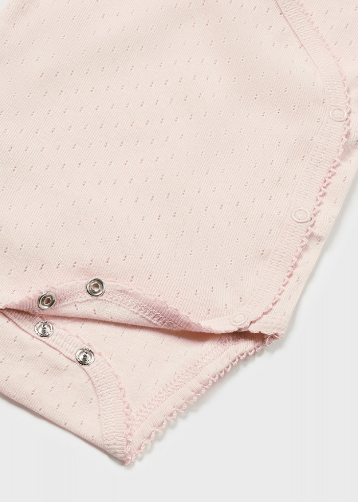 Body s krátkym rukávom pre novorodencov. Prekrížený výstrih a bočný rozparok, ktorý sa zapína na patentky. Zapínanie na gombíky v rozkroku na jednoduché obliekanie a vyzliekanie. Vo väčších veľkostiach tohto modelu (od 4 - 6 do 18 mesiacov) je bočný rozparok nahradený patentkami na ramienku.