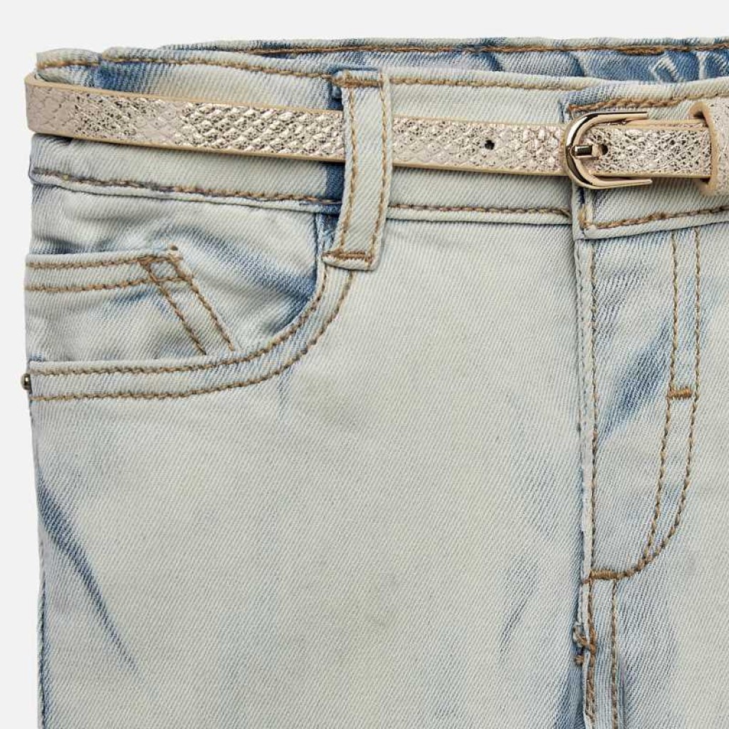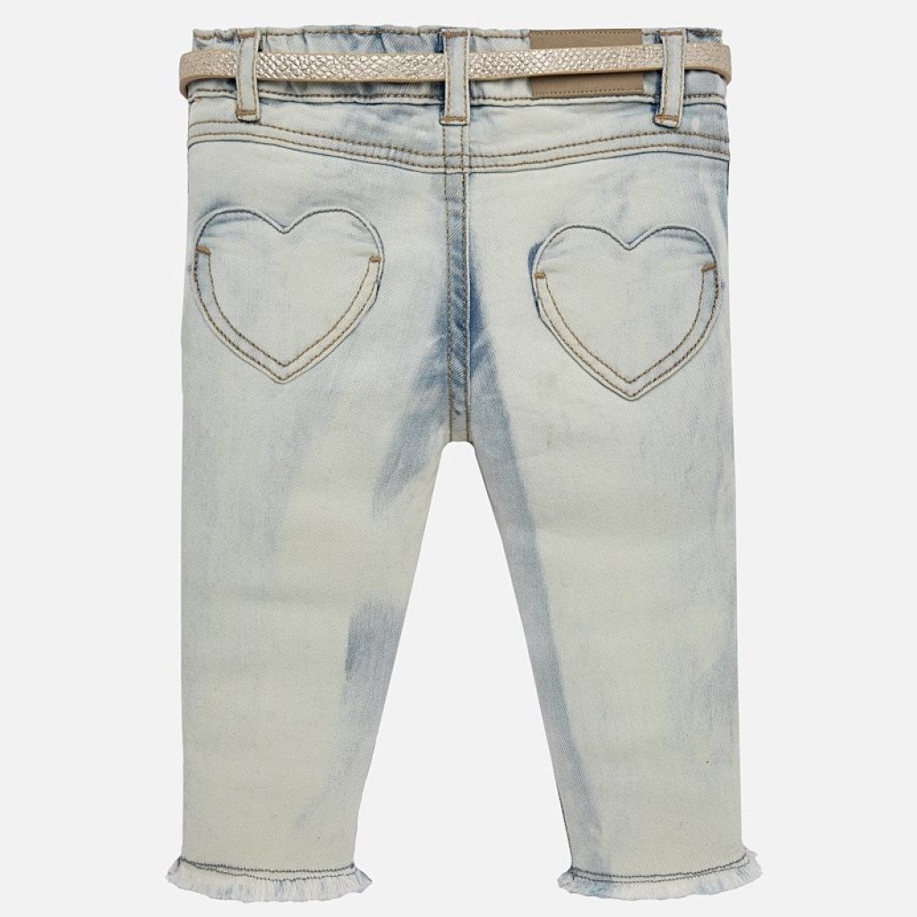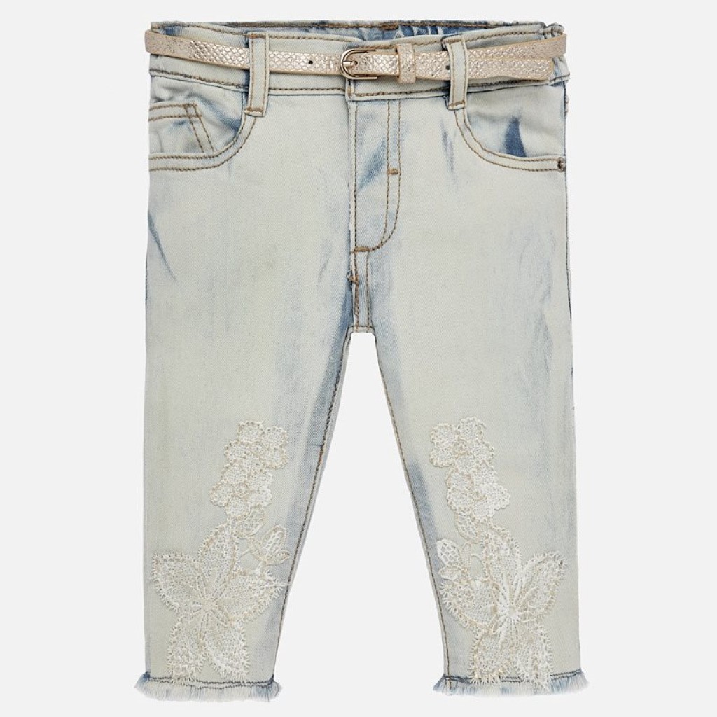 Štíhlé nohavice pre dievčatá patriace do našej dievčenskej kolekcie , ktoré sa dokonale prispôsobujú postave. Elastický pás so zapínaním pomocou gombíkov. Vyrobené z modernej denimovej tkaniny s umývaným efektom a opotrebovaným povrchom. Dizajn s viacerými vreckami. Dekoratívne prvky: ozdobné aplikácie, roztrhané spodné lemovanie. Pre odev je charakteristická remeselná výroba, nezrovnalosti vo farbe a štruktúre.