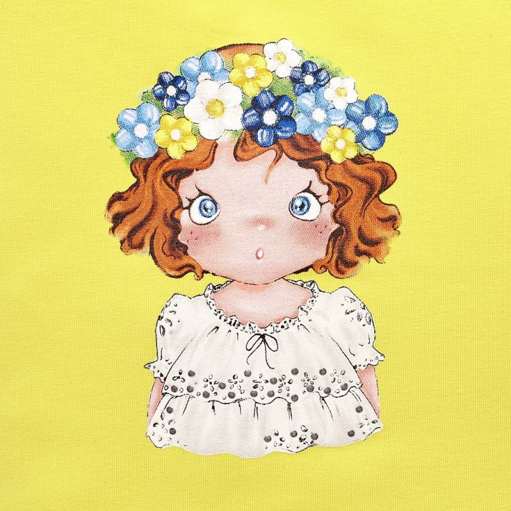 Tričko s krátkym rukávom pre dievčatá. Okrúhly výstrih. Uzatváracie gombíky na zadnej strane umožňujú ľahké oblečenie trička. Vyrobené z mäkkej elastickej bavlnenej tkaniny. Moderný dizajn. Dekoratívne prvky: potlač vpredu.