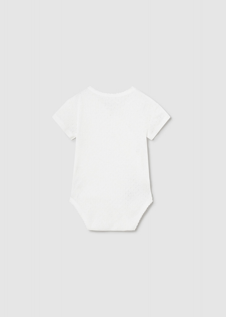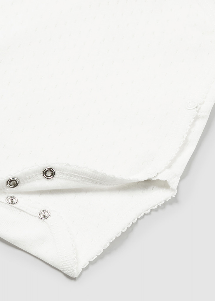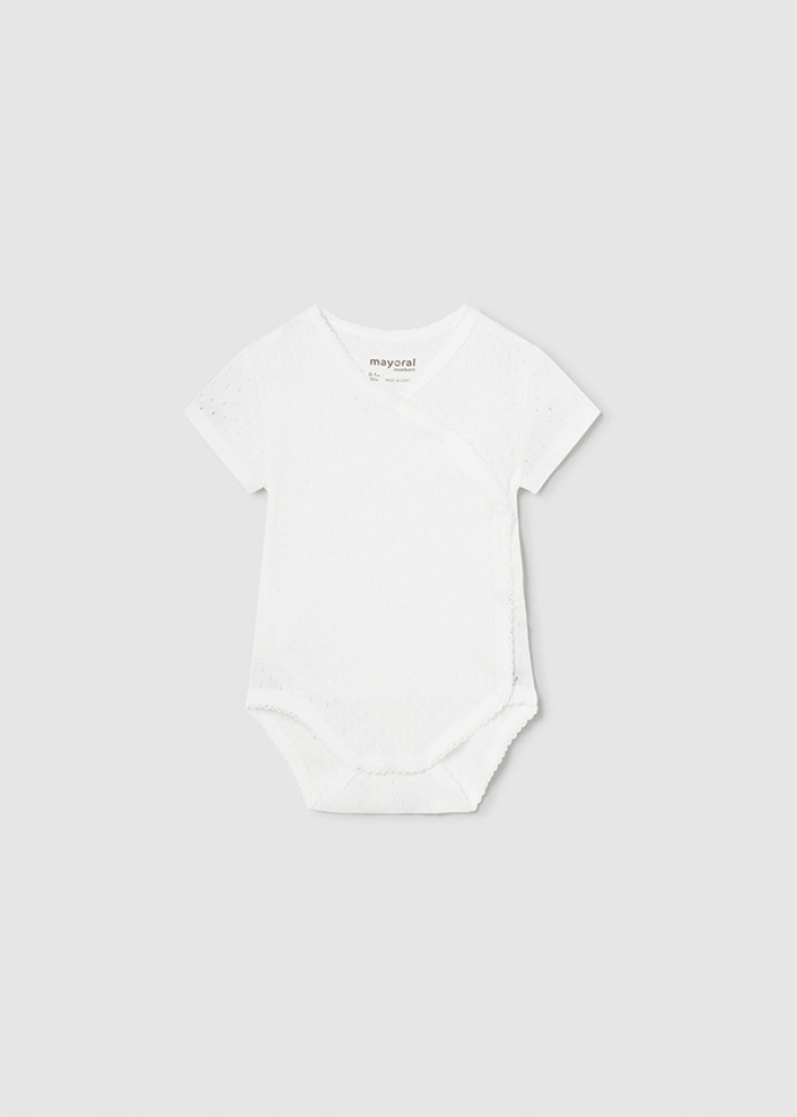 Body s krátkym rukávom pre novorodencov. Prekrížený výstrih a bočný rozparok, ktorý sa zapína na patentky. Zapínanie na gombíky v rozkroku na jednoduché obliekanie a vyzliekanie. Vo väčších veľkostiach tohto modelu (od 4 - 6 do 18 mesiacov) je bočný rozparok nahradený patentkami na ramienku.